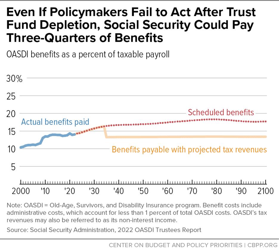 Even if the trust fund is entirely depleted, projected future payroll taxes will still cover about 77% of scheduled benefits.